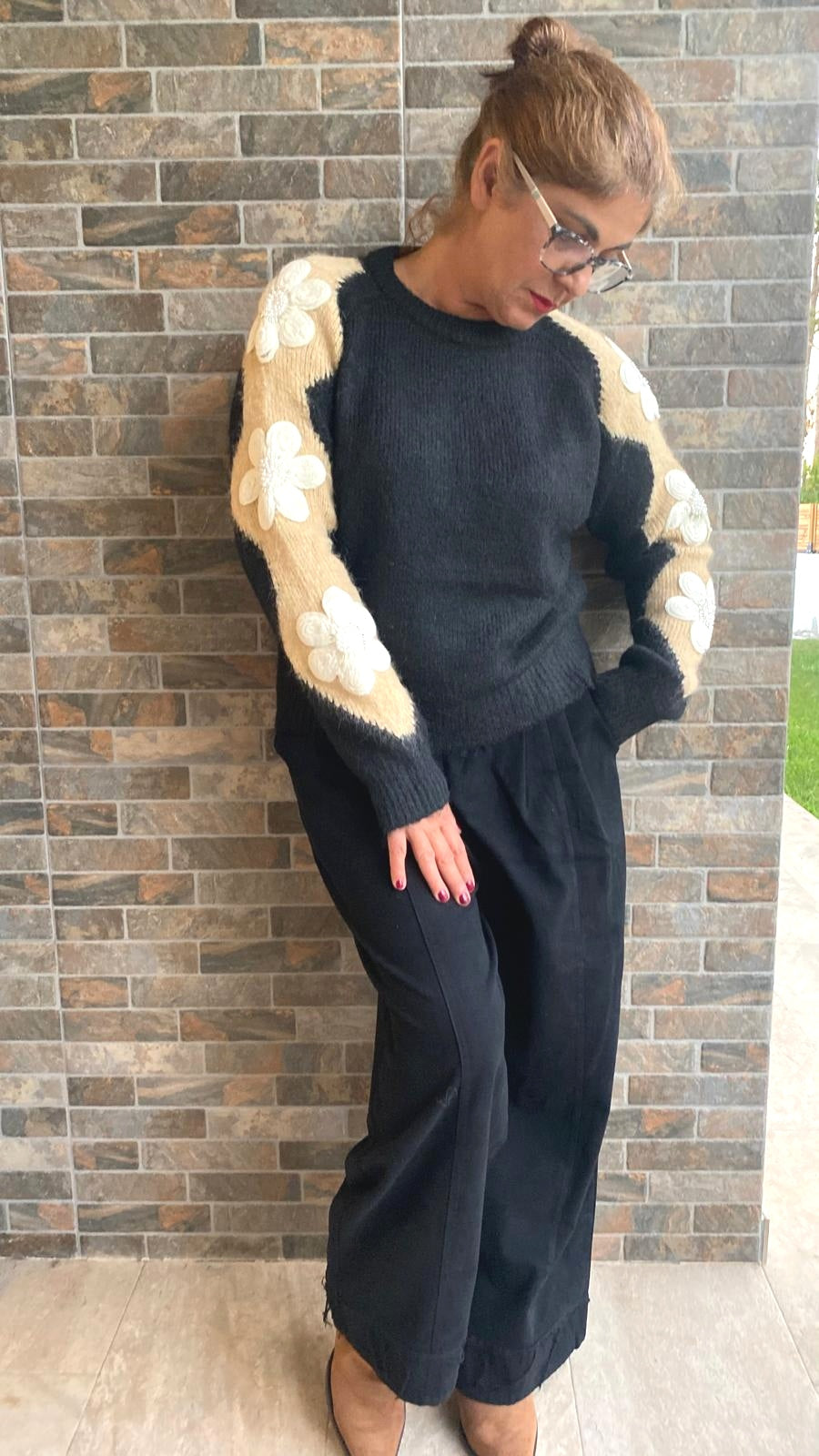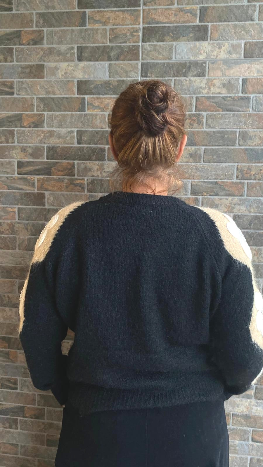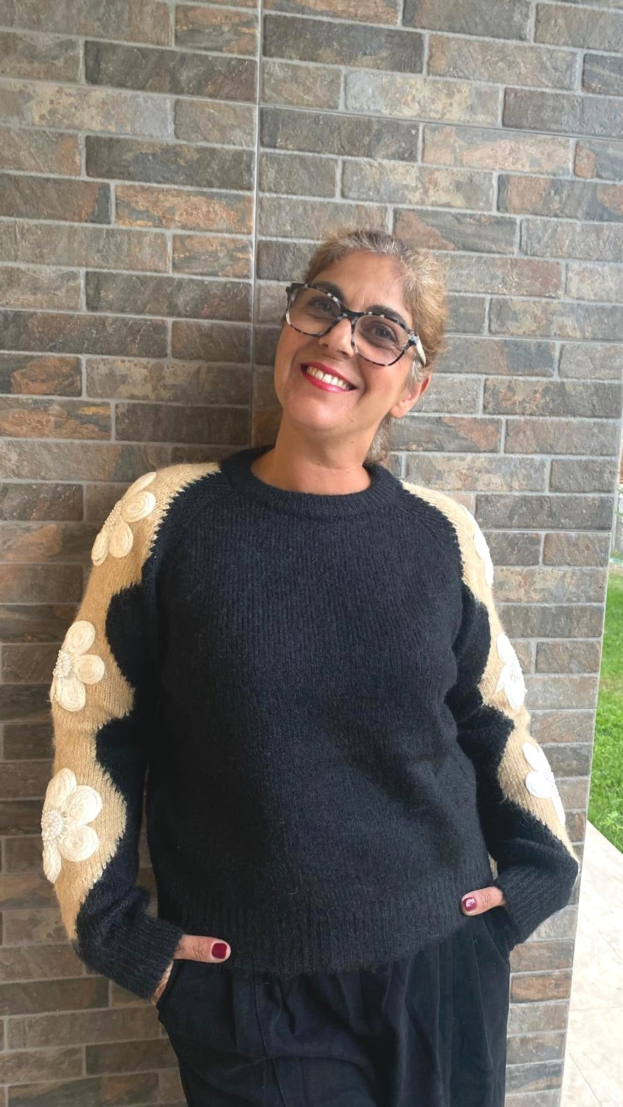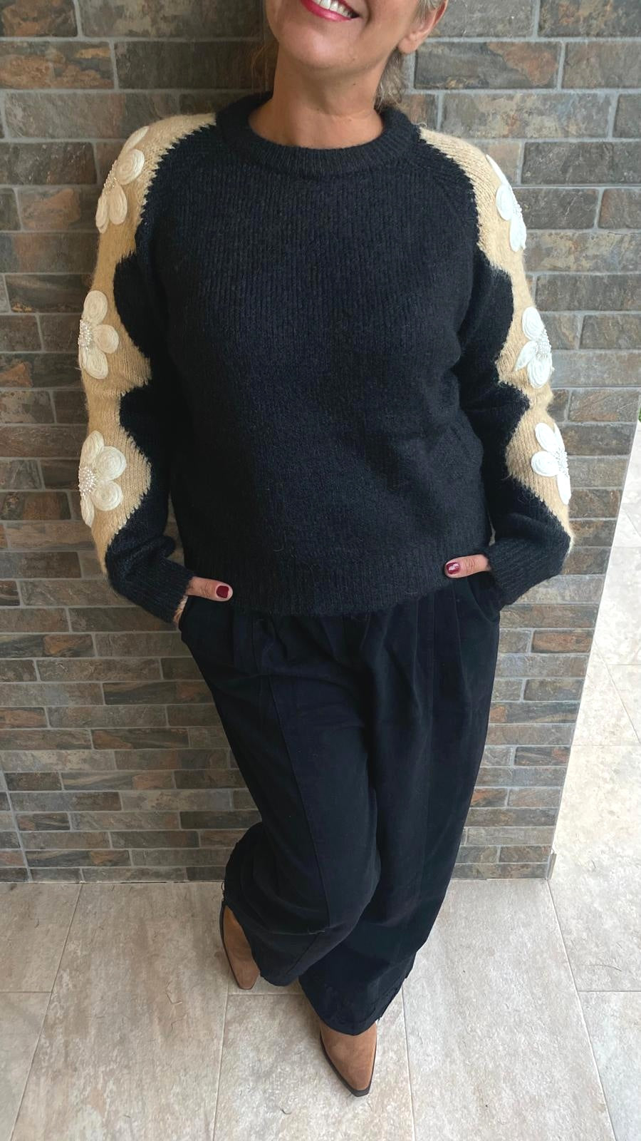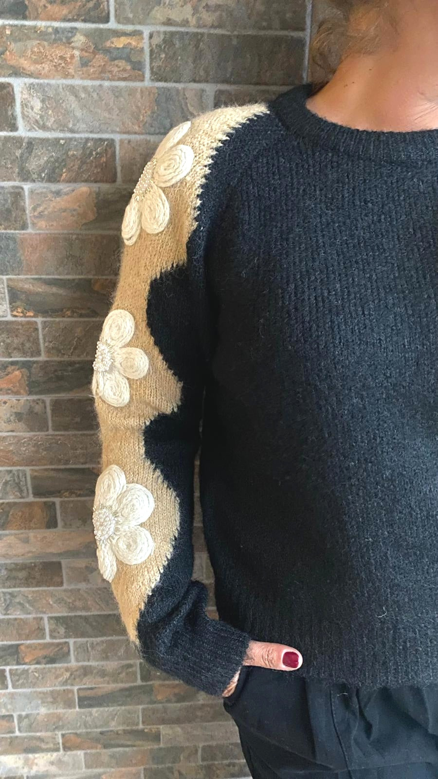 Camisola de lã com aplicações na manga. Decote redondo